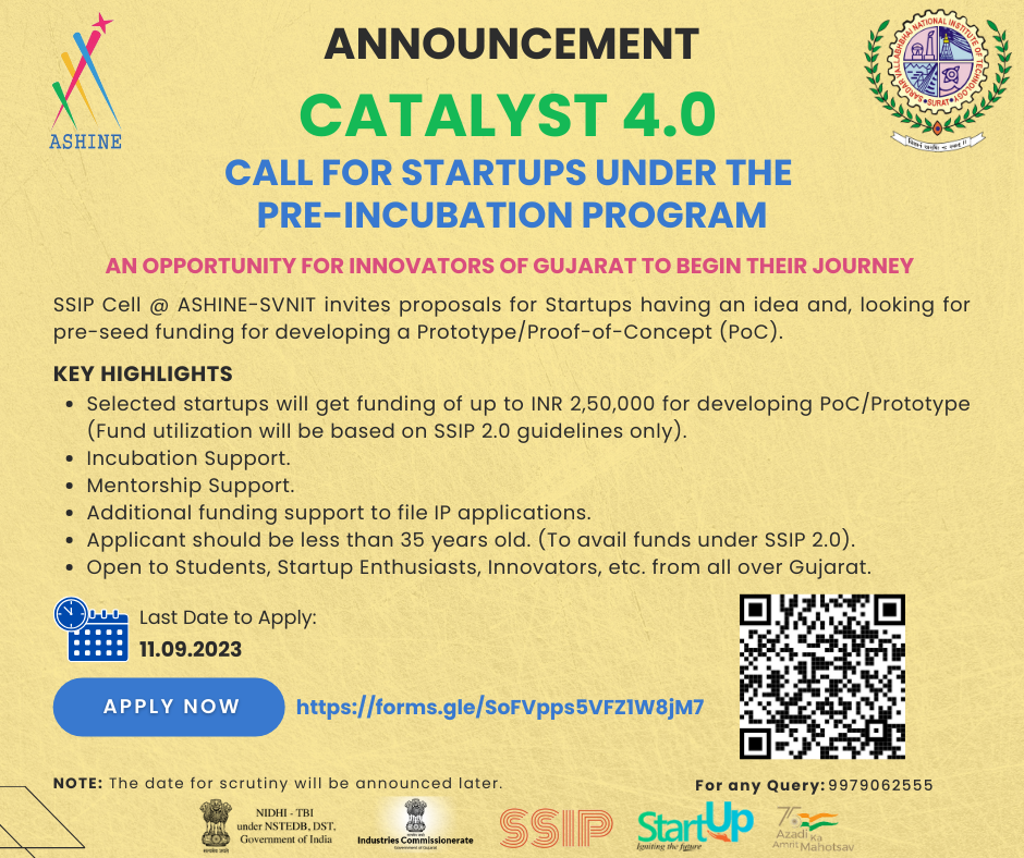 With the support from Student Startup & Innovation Policy (SSIP 2.0), SSIP Cell & ASHINE (Technology Business Incubator) at SVNIT invites applications under CATALYST 4.0. A pre-seed funding program at ASHINE - SVNIT that provides pre-incubation and allied support to startups in order to accelerate the development of their ideas into a prototype.