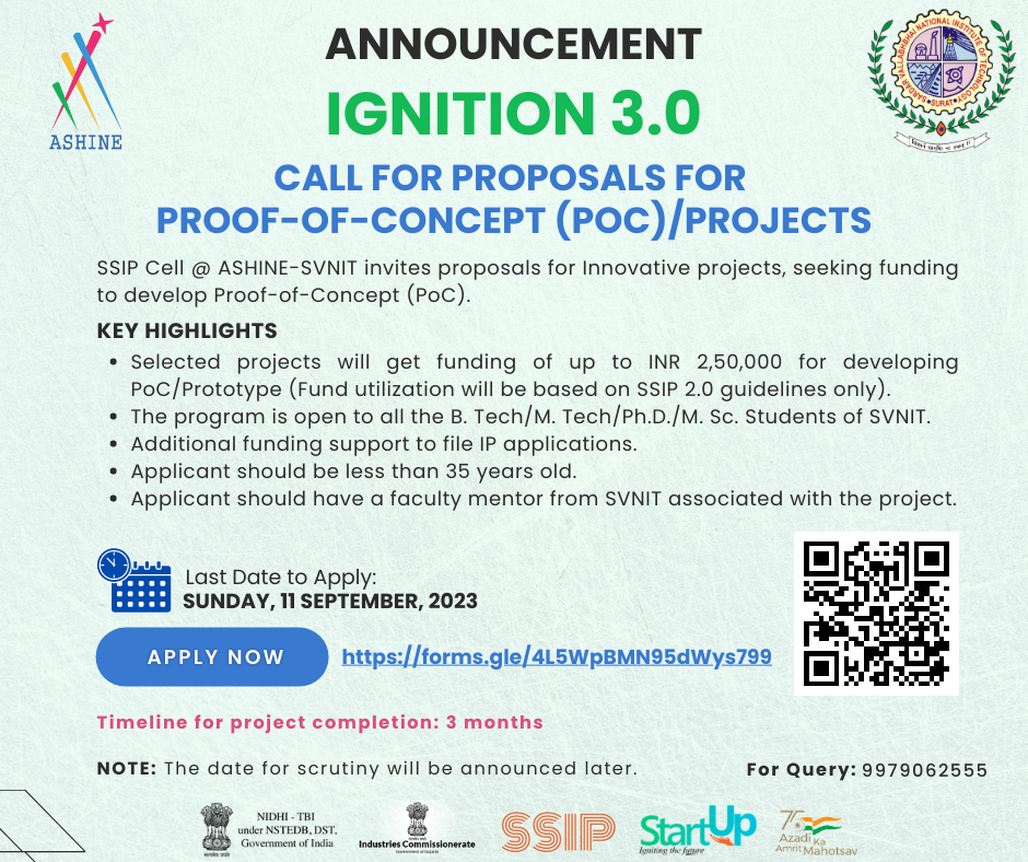 SSIP Cell @ ASHINE-SVNIT invites proposals for Innovative projects seeking funding to develop Proof-of-Concept (PoC).