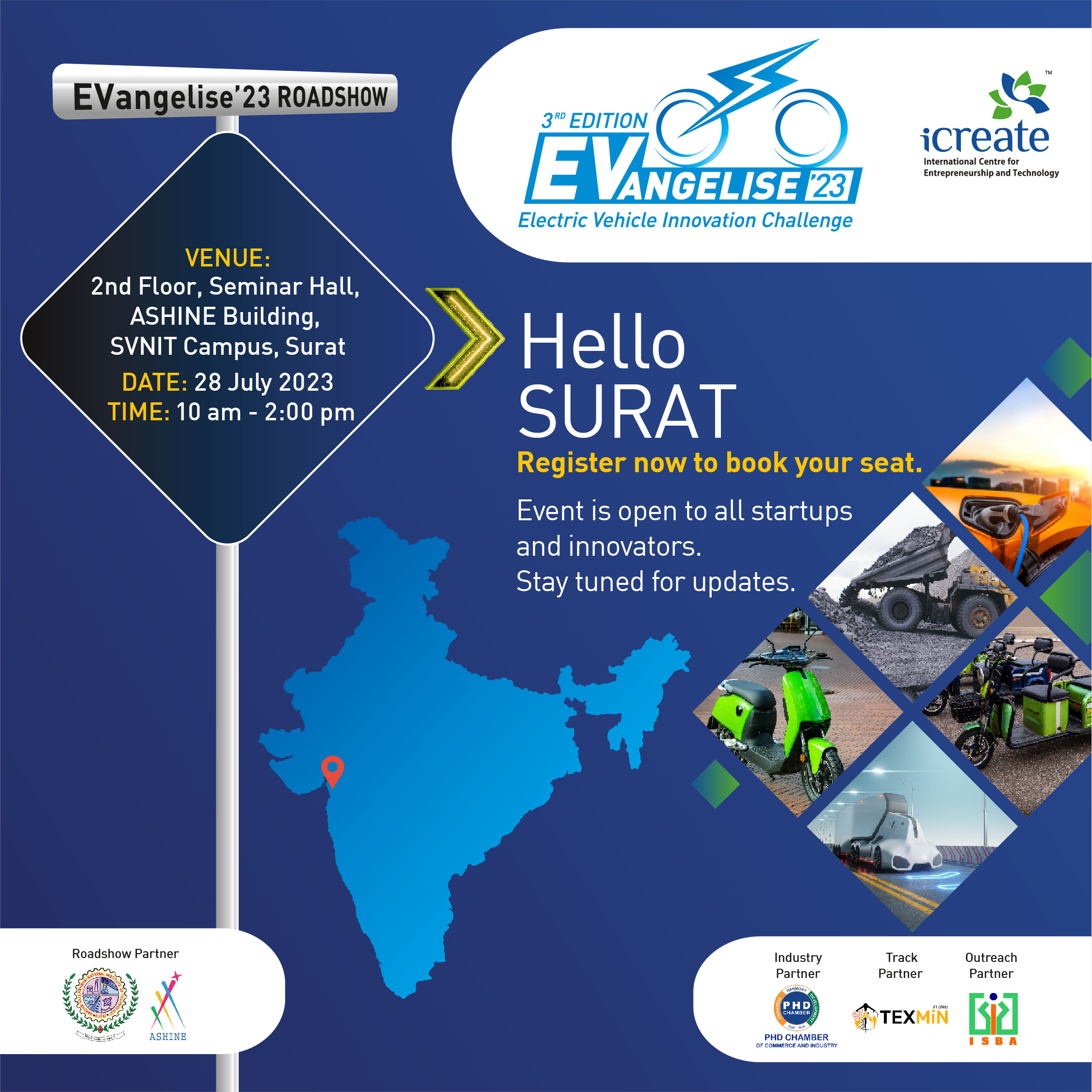 Join us for the EVangelise '23 roadshow, an exciting event organized by iCreate in collaboration with ASHINE-SVNIT, Surat as part of the Electric Vehicle Innovation Challenge. This roadshow aims to connect with all electric vehicle enthusiasts and provide them with a unique opportunity to turn their EV dreams into reality. Don't miss out on this incredible chance!
